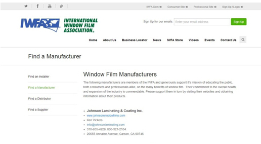 晚年的Alan • Johnson决心为这个他奉献了一生的行业做点什么,于是他联合了全球各著名窗膜制造商,制定了窗膜行业最高的质量和技术标准,成立了窗膜行业权威机构IWFA (international window film association)。 Alan • Johnson坚持只收纳具有独立研发技术和工厂的优秀公司,到现在也仅有7家通过认证。