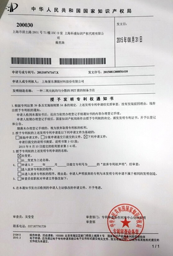 紫东薄膜公司在研发试制生产智能膜期间,同步进行着发明专利的申请。日前已申请的4项发明专利中的2项已被国家知识产权局授予发明专利权,分别是一种二氧化钒均匀分散的PET膜的制备方法和一种二氧化钒均匀分散的改性PET膜的制备方法。