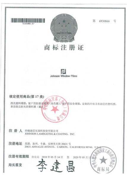 另外,就中材国际贸易(北京)有限公司引进的“Johnson Window Films(强生)”玻璃膜做以下说明: