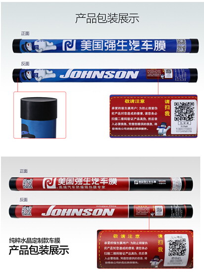 四、“Johnson Window Films(强生)”玻璃膜现有2种版本膜桶包装(如下图),其中红色包装为“存粹水晶定制款”,仅用于天猫销售使用,消费者购买后请扫膜桶上唯一二维码进行防伪查询,并进行质保登记,以便享受完整的质保服务。
