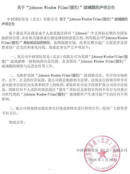 二十多年来,中材国际贸易(北京)有限公司一直为美国“Johnson Window Films(强生)”玻璃膜唯一授权的国内总代理,每卷膜都是100%原装进口,有海关单号可查。现有不法商家或个人恶意抢注持有“Johnson”中文商标近期在全国各地招商引资,并在相关媒体进行擦边球似的恶意宣传,利用“Johnson Window Films(强生)”商标相近似的特征,意图混淆市场。鉴于该行为已引起广大投资者及消费者的困扰,对“Johnson Window Films(强生)”玻璃膜造成了不好的影响。现就此事宜严正声明如下: