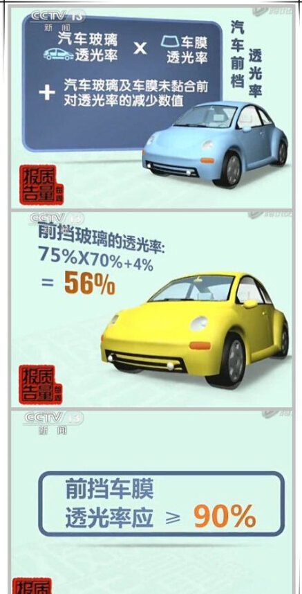 此前《每周质量报告》曾专门针对“前挡贴膜透光率”问题做到相关报道,曝出大多数车主所贴的前挡车膜根本不达标,商家所称的透光率达到国标70%是偷梁换柱,前挡张贴这种仅为70%透光率的薄膜后,透光率降为50%左右,大大低于70%的法定最低指标!这给车主带来严重的行车安全隐患。