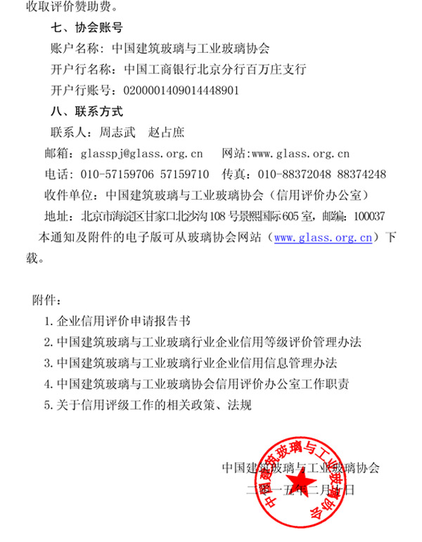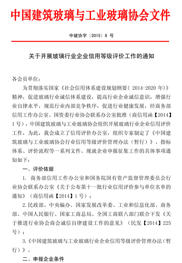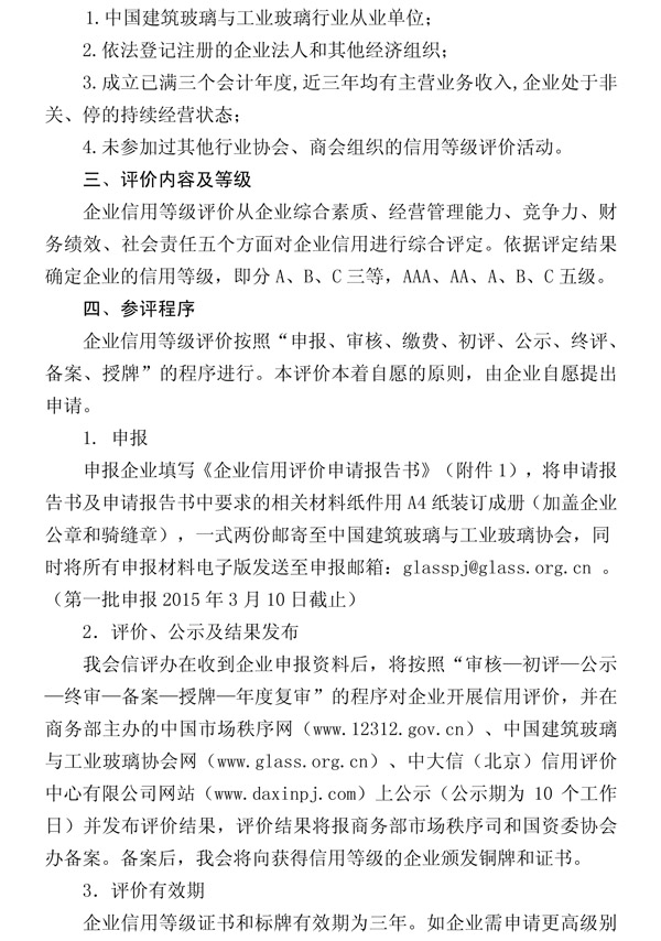 核心提示: 附件1 企业信用评价申请报告书.doc 附件2 中国建筑玻璃与工业玻璃行业企业信用等级评价管理办法(暂行).doc 附件3 中国建筑玻璃